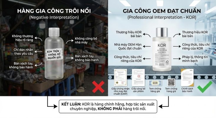 Còn nếu bạn hiểu “hàng gia công” theo đúng nghĩa chuyên môn: sản phẩm được sản xuất tại nhà máy OEM Hàn Quốc đạt chuẩn, dựa trên công thức, tiêu chí chất lượng mà thương hiệu KOR đưa ra, thì câu trả lời là:
