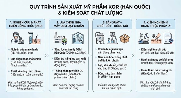 Để yên tâm hơn về KOR mỹ phẩm Hàn Quốc, bạn có thể tìm hiểu tổng quan về quy trình sản xuất mỹ phẩm Hàn nói chung. Dù KOR hợp tác với nhà máy tự có hay OEM, các bước cơ bản thường gồm: