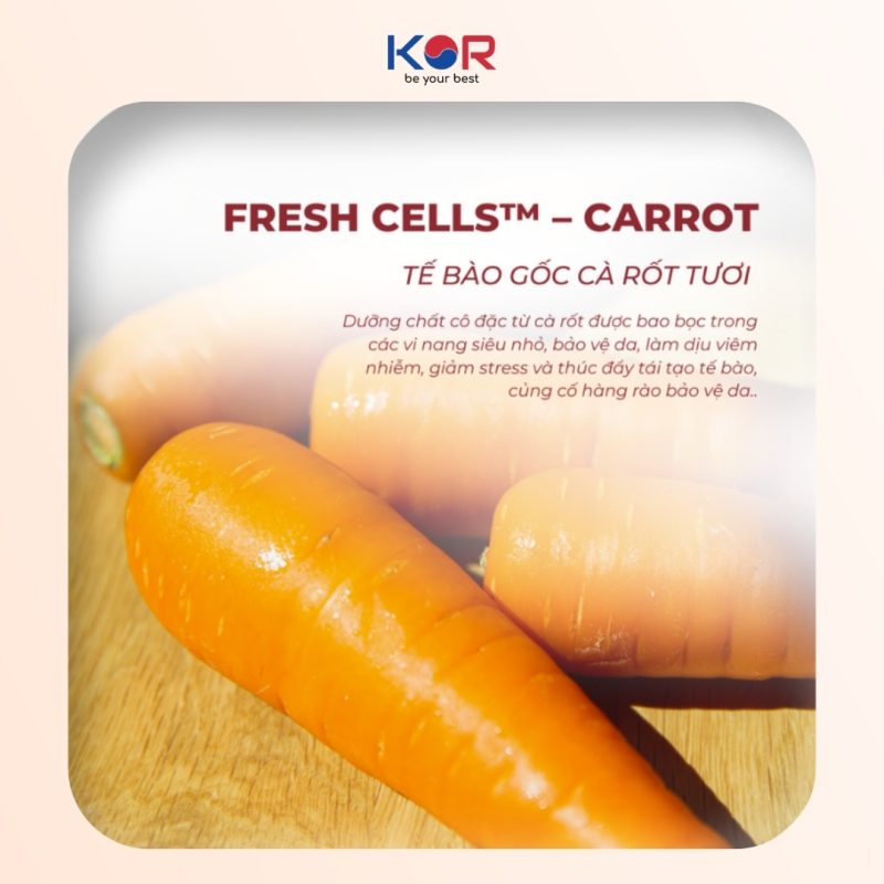 Fresh Cells™ – Carrot là một thành phần chăm sóc da mạnh mẽ, không chỉ giúp cấp ẩm sâu và bảo vệ da khỏi stress, mà còn kích thích tái tạo tế bào, làm sáng và cải thiện độ đàn hồi cho da. Nhờ vào các dưỡng chất quý giá như vitamin C, kali, và magiê, Fresh Cells™ – Carrot hỗ trợ làn da khỏe mạnh từ bên trong. Sử dụng các sản phẩm chứa Fresh Cells™ – Carrot sẽ giúp bạn duy trì làn da tươi trẻ, mịn màng và rạng rỡ. Hãy trải nghiệm ngay các sản phẩm của KOR để cảm nhận sự khác biệt!