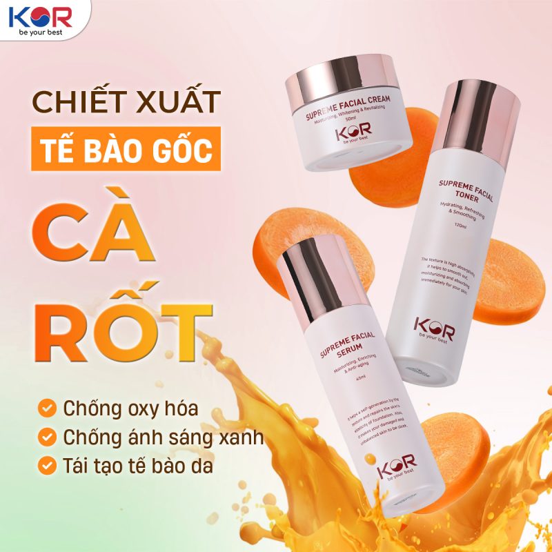 Kem Dưỡng KOR Supreme Facial: Kem dưỡng ẩm này tận dụng tác dụng của Fresh Cells™ – Carrot để bổ sung dưỡng chất và làm mềm da, đồng thời bảo vệ da khỏi các tác động xấu từ môi trường. Ngoài việc cung cấp độ ẩm, cà rốt còn giúp làm sáng da, chống lão hóa, và cải thiện độ đàn hồi của da.